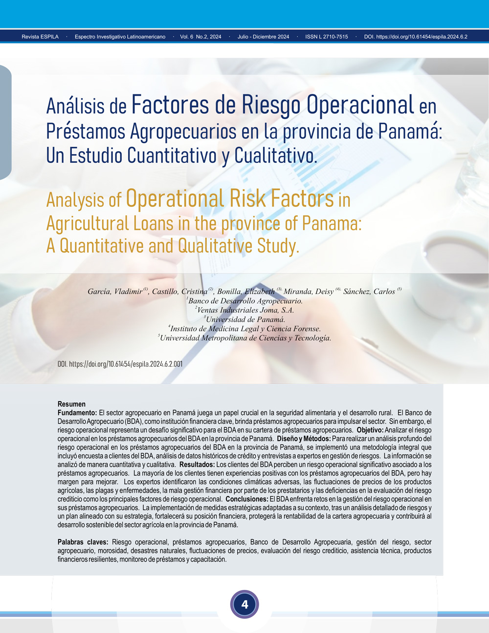 Fundamento: El sector agropecuario en Panamá juega un papel crucial en la seguridad alimentaria y el desarrollo rural. El Banco de Desarrollo Agropecuario (BDA), como institución financiera clave, brinda préstamos agropecuarios para impulsar el sector. Sin embargo, el riesgo operacional representa un desafío significativo para el BDA en su cartera de préstamos agropecuarios. Objetivo: Analizar el riesgo operacional en los préstamos agropecuarios del BDA en la provincia de Panamá. Diseño y Métodos: Para realizar un análisis profundo del riesgo operacional en los préstamos agropecuarios del BDA en la provincia de Panamá, se implementó una metodología integral que incluyó encuesta a clientes del BDA, análisis de datos históricos de crédito y entrevistas a expertos en gestión de riesgos. La información se analizó de manera cuantitativa y cualitativa. Resultados: Los clientes del BDA perciben un riesgo operacional significativo asociado a los préstamos agropecuarios. La mayoría de los clientes tienen experiencias positivas con los préstamos agropecuarios del BDA, pero hay margen para mejorar. Los expertos identificaron las condiciones climáticas adversas, las fluctuaciones de precios de los productos agrícolas, las plagas y enfermedades, la mala gestión financiera por parte de los prestatarios y las deficiencias en la evaluación del riesgo crediticio como los principales factores de riesgo operacional. Conclusiones: El BDA enfrenta retos en la gestión del riesgo operacional en sus préstamos agropecuarios. La implementación de medidas estratégicas adaptadas a su contexto, tras un análisis detallado de riesgos y un plan alineado con su estrategia, fortalecerá su posición financiera, protegerá la rentabilidad de la cartera agropecuaria y contribuirá al desarrollo sostenible del sector agrícola en la provincia de Panamá.